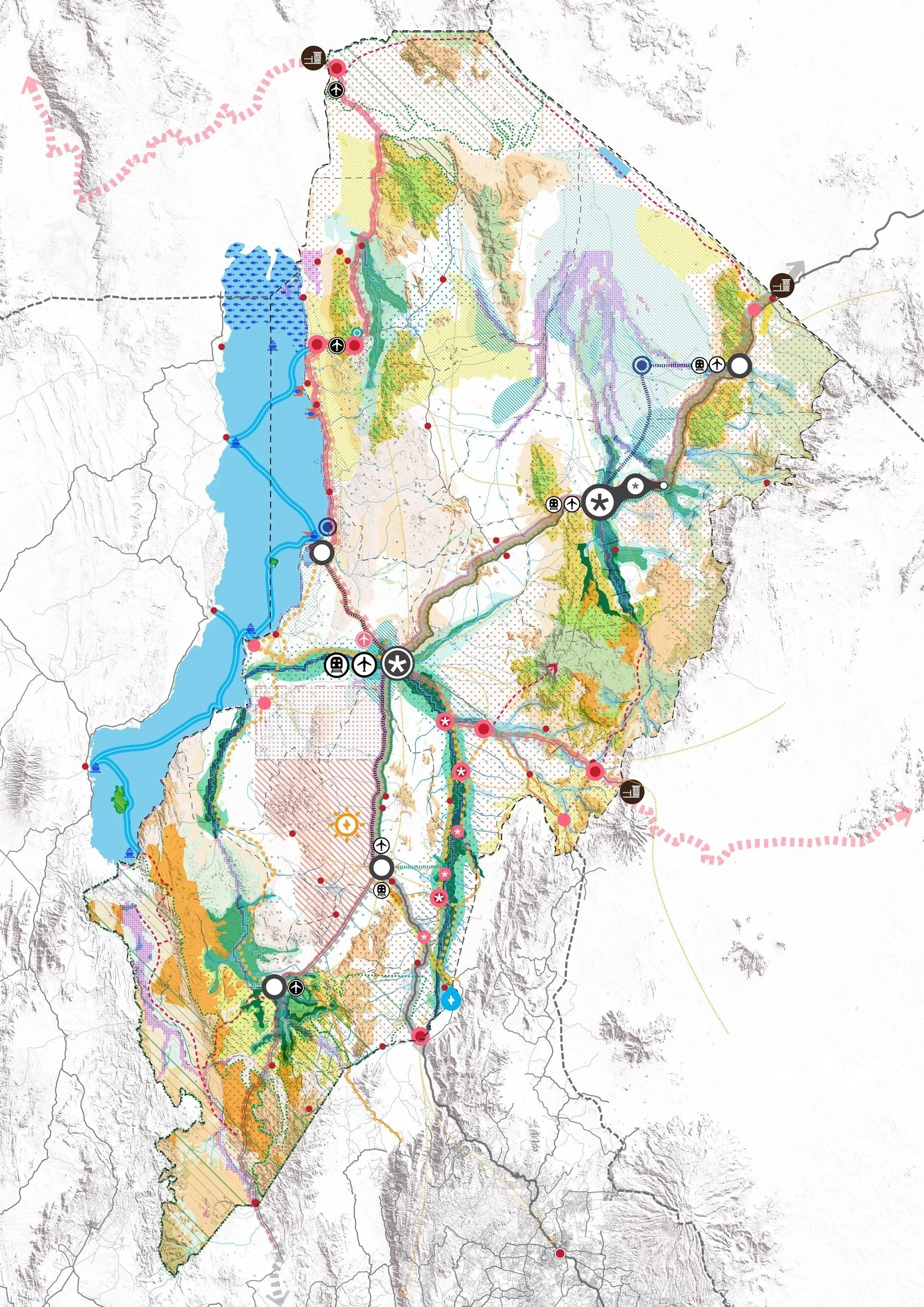 The plan takes a regenerative and landscape-based approach, building from analysis of the region's environment and natural systems and prioritising their protection and restoration. In this water-stressed region, water availability is critical, so the plan identifies supply strategies and prioritises integrated catchment management and large-scale afforestation to restore catchment health. A spatial-economic strategy then identifies future development opportunities across sectors—agriculture, tourism, mineral resources, and industry—based on the inherent potential of the landscape. Population growth is directed toward settlements and growth corridors aligned with this economic potential, with infrastructure investment targeted to support planned growth.